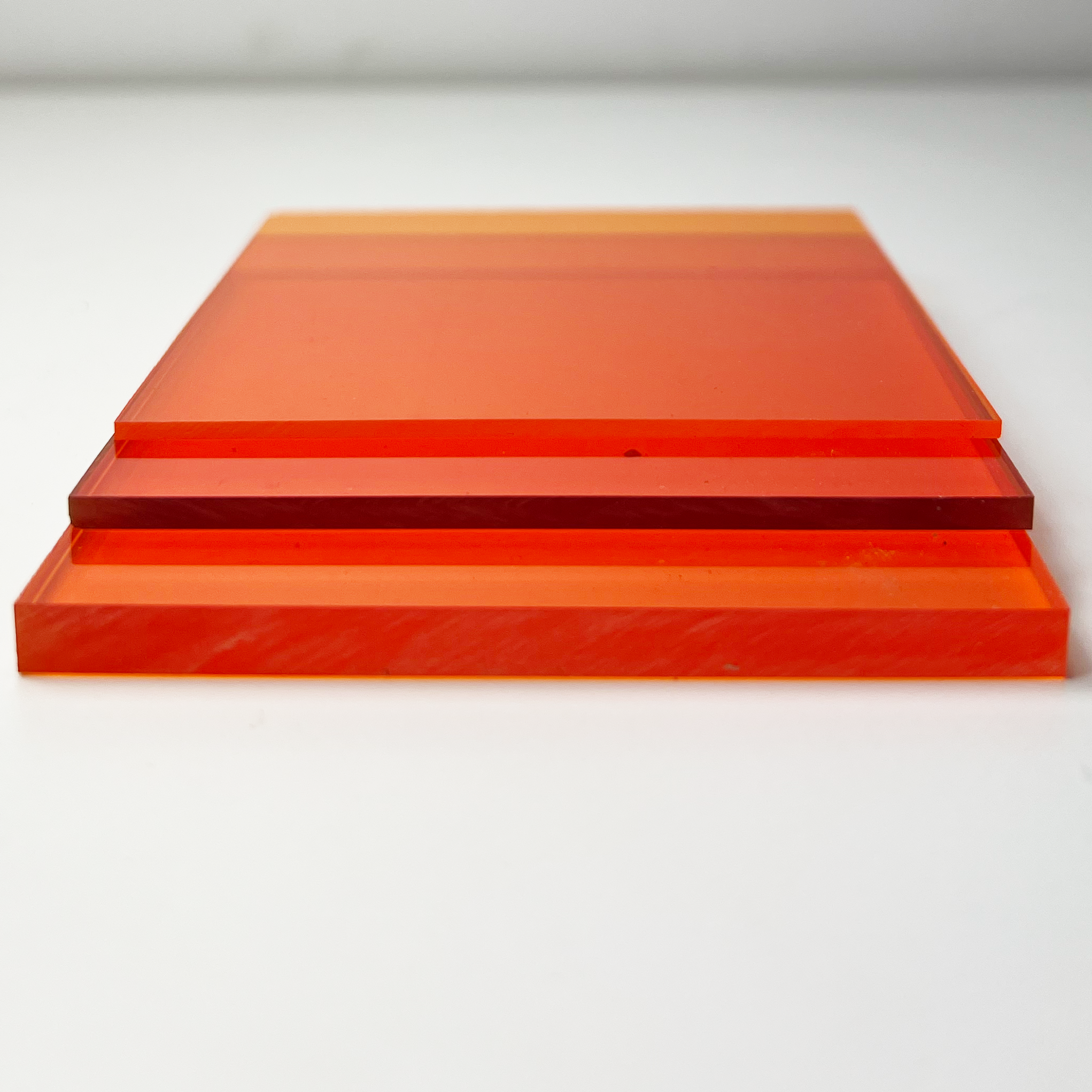 Our Transparent Orange Cast Acrylic (PMMA) sheets are the optimal choice for laser cutting, engraving, CNC routing, signage, and DIY crafts. Known as Plexiglas® (Arkema), Lucite® (DuPont), or Perspex®, these glossy, transparent orange sheets offer 85% light transmission, blending bold color with a measure of see-through clarity.