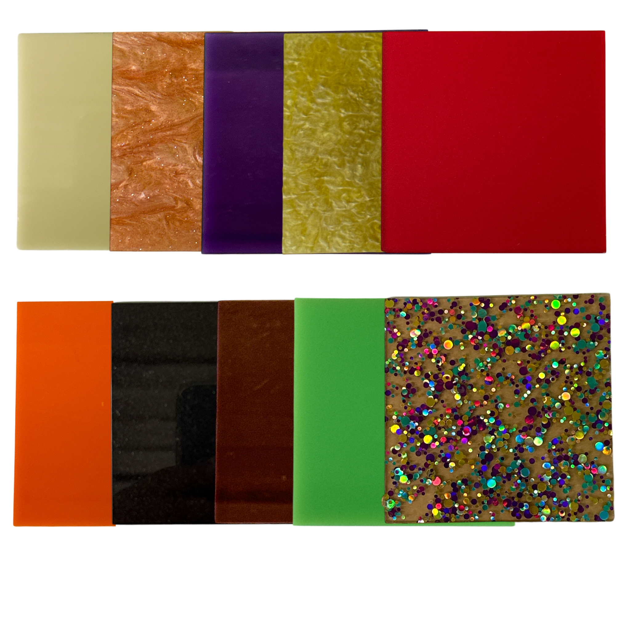 Materials: Cast acrylic (PMMA) in Orange Nearly Opaque, Purple Nearly Opaque, Brown Nearly Opaque, Ivory Translucent, Green Neon, Black Glitter, Confetti Dot, Orange Cosmos, Yellow Scales, Cherry Red Frosted (10 sheets total).